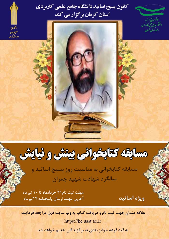 به مناسبت سالروز شهادت استاد بزرگ شهید دکتر مصطفی چمران مسابقه کتابخوانی کتاب «بینش و نیایش» در دانشگاه جامع علمی کاربردی استان کرمان برگزار میشود.