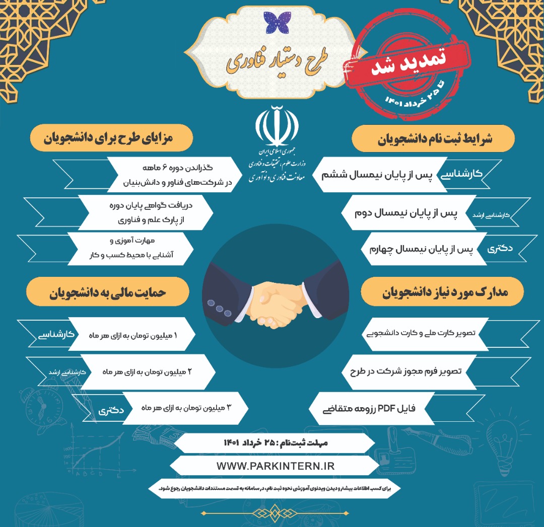 لازم به توضیح است مهلت ثبت نام برای دانشجویان مقطع کارشناسی (و بالاتر) تا تاریخ 25 خرداد ماه تعیین شده است. دانشجویان متقاضی می توانند جهت کسب اطلاعات بیشتر به مراکز آموزش علمی کاربردی محل تحصیل خود مراجعه نمایند. سامانه ثبت نام طرح مذکور https://www.parkintern.ir/ می باشد که دانشجویان جهت ثبت نام بایستی به این آدرس مراجعه نمایند.